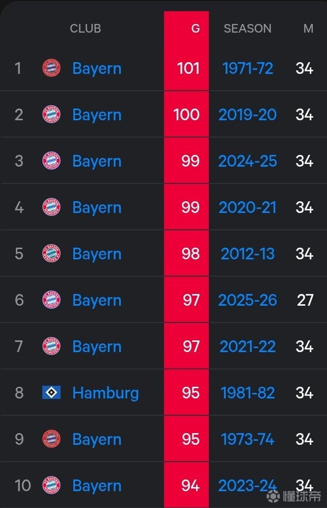 还有7轮,拜仁本赛季进球数已位列德甲历史第六位