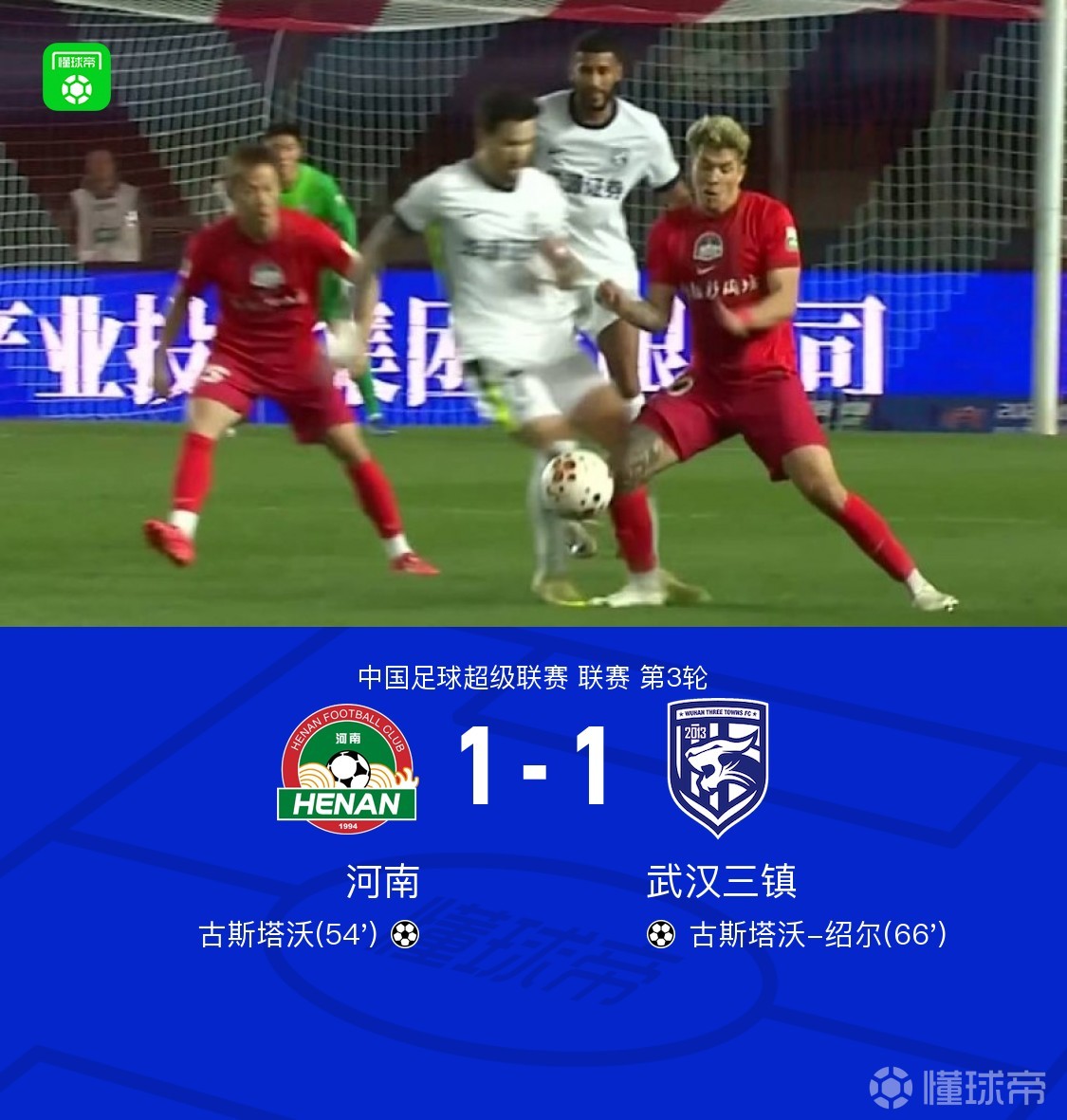 河南1-1三镇,古斯塔沃破门,绍尔扳平,方镜淇一度手指错位