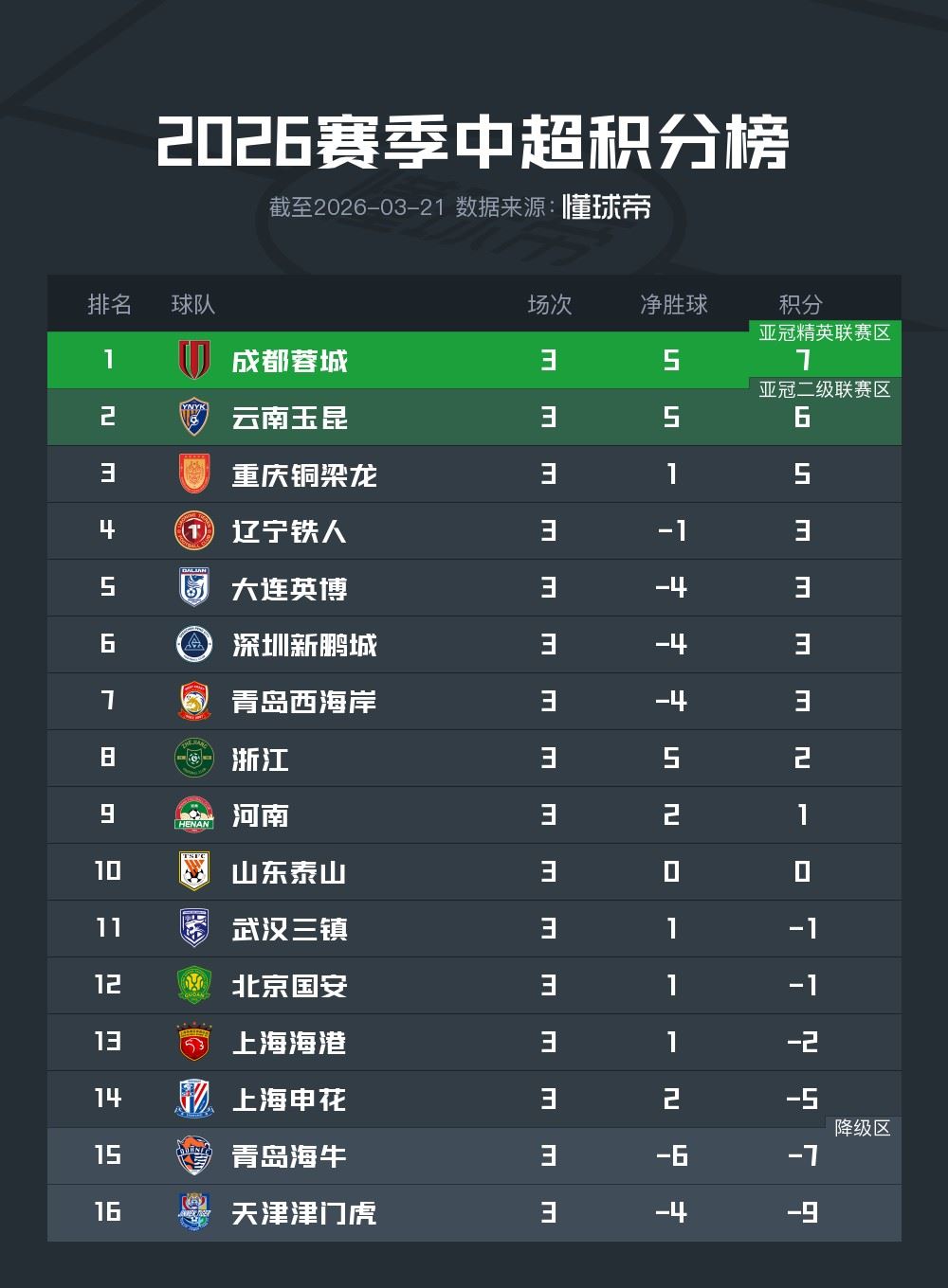 中超积分榜:蓉城、玉昆、铜梁龙前三 6队仍负分
