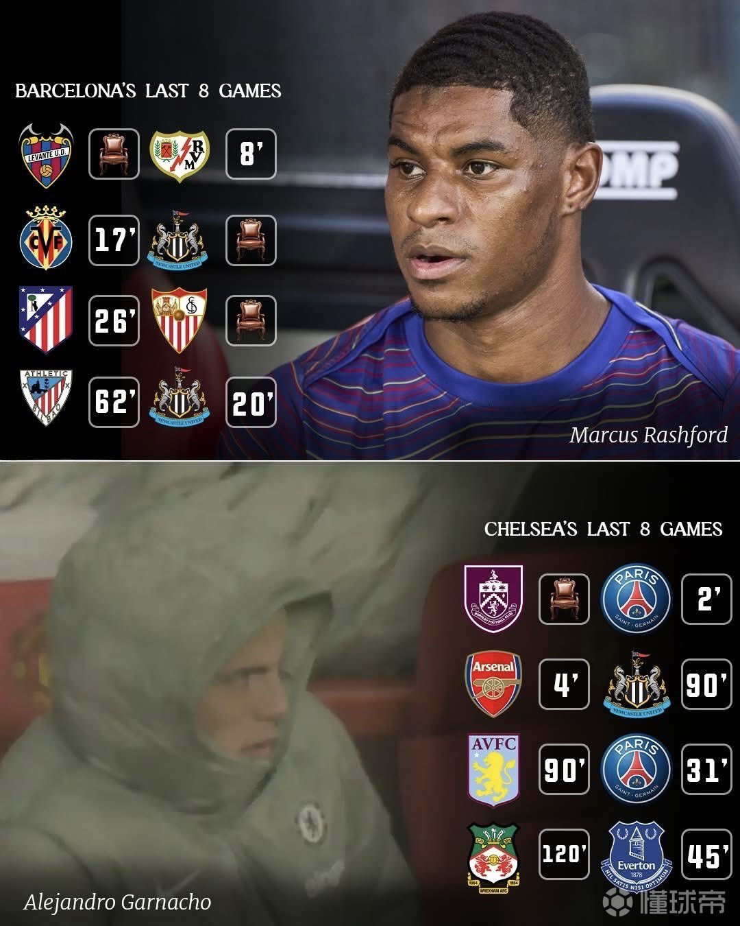拉什福德近八场比赛中仅获得一次首发机会,而加纳乔...