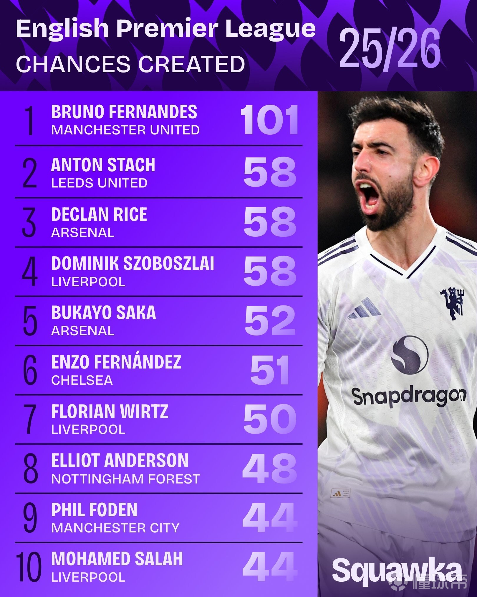 本赛季英超创造机会榜:B费101次领跑;赖斯、索博58次第二