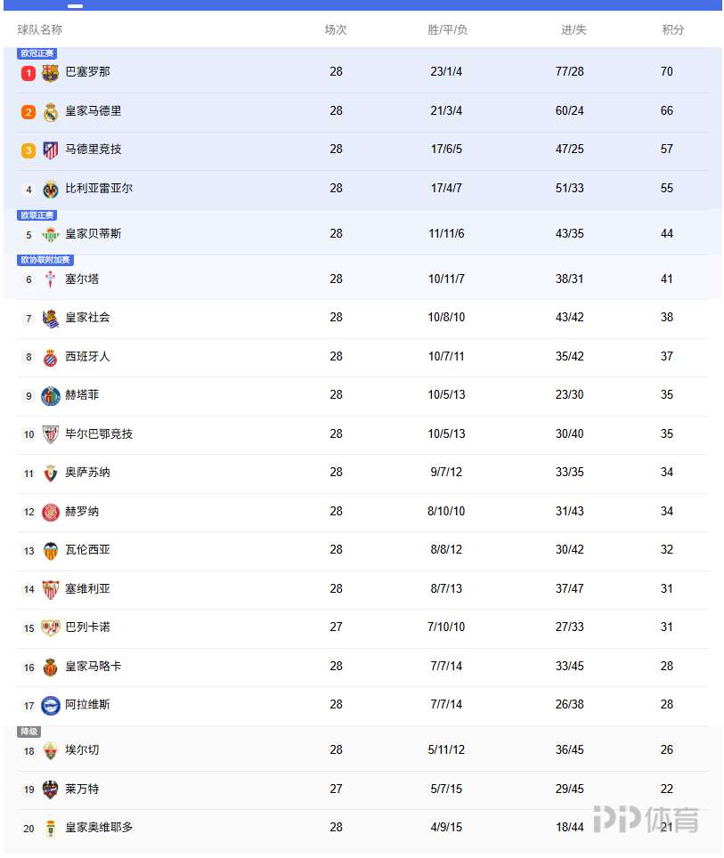 西甲积分榜:巴萨继续4分领跑,马竞第三黄潜第四