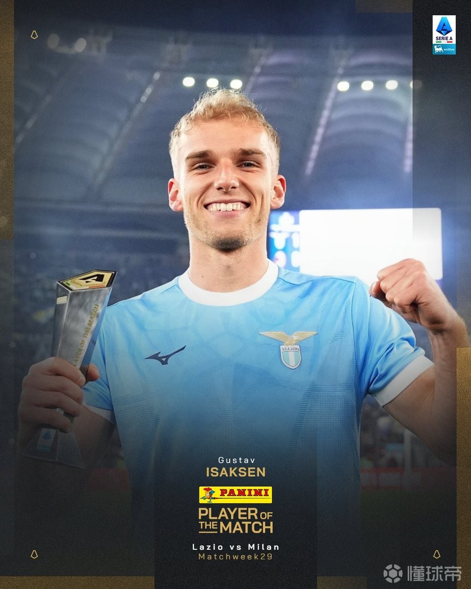 打进唯一进球助拉齐奥击败米兰,伊萨克森当选全场最佳球员