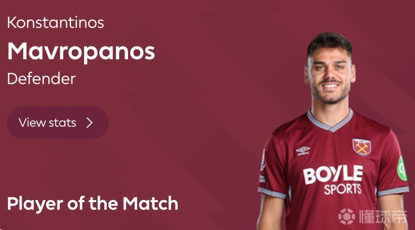 头球破门+10次解围,马夫罗帕诺斯当选西汉姆1-1曼城全场最佳