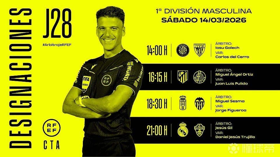 周六西甲裁判:希尔-曼萨诺将执法皇马vs埃尔切
