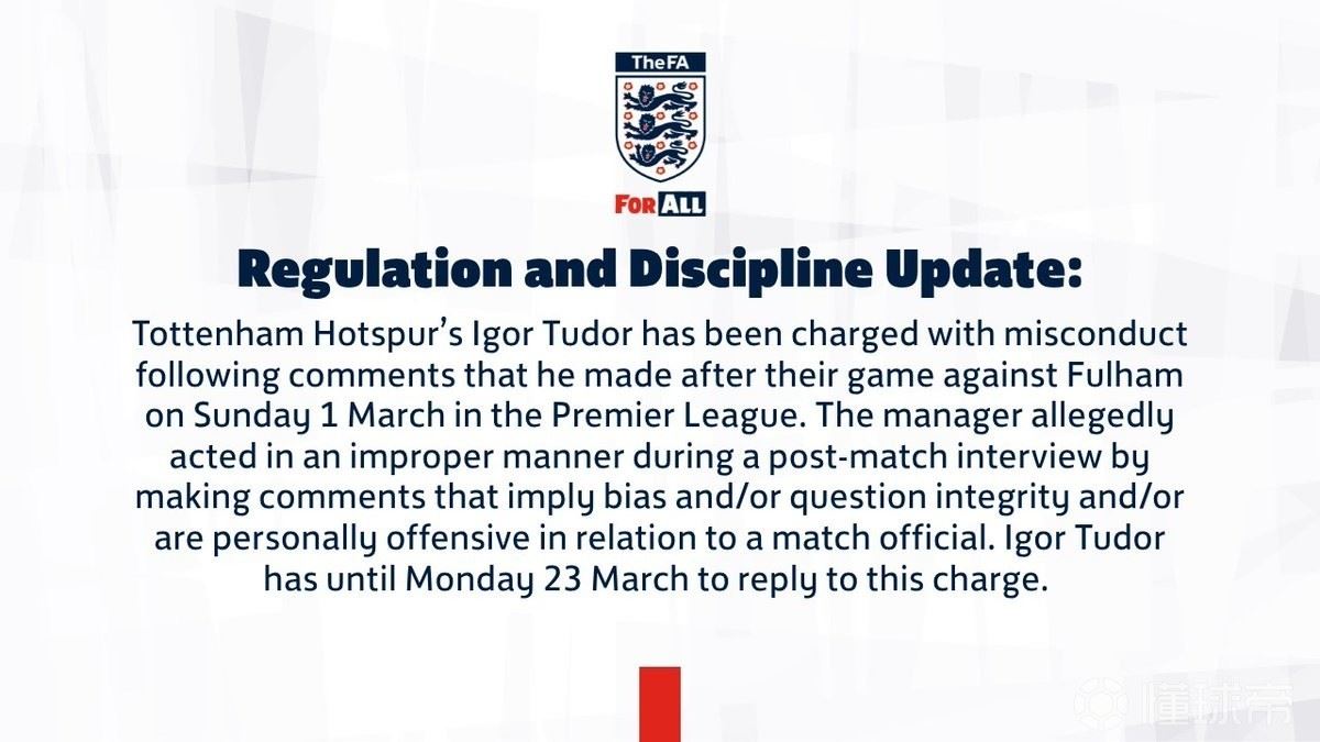 因对阵富勒姆赛后发表不当言论,热刺主帅图多尔被英足总指控