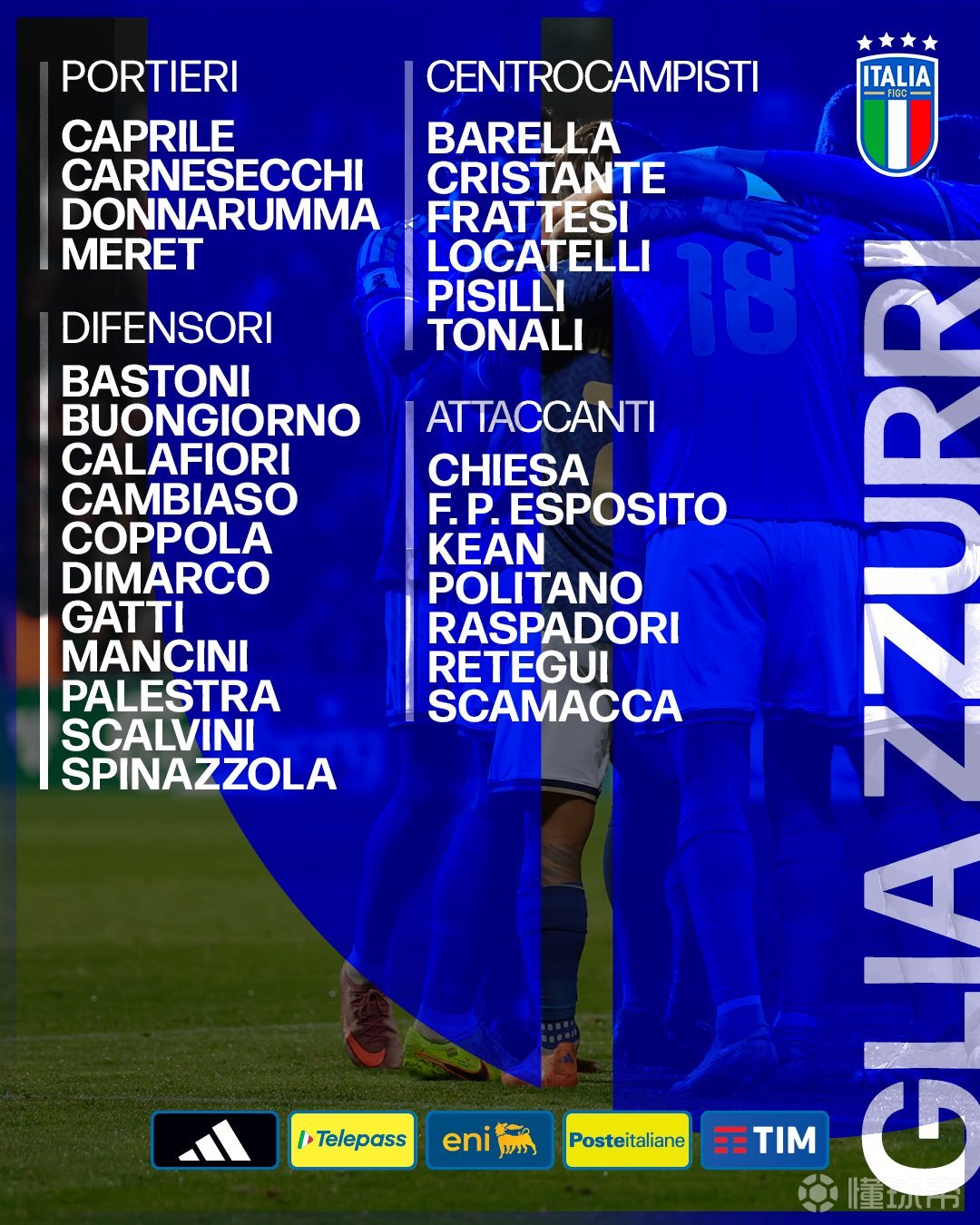 意大利大名单:巴雷拉、托纳利入围,小基耶萨、迪马尔科在列